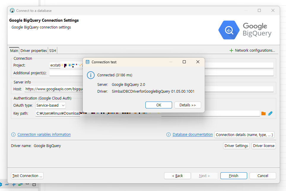 해당 키파일을 통해 bigquery접속을 진행합니다. - DBeaver 접속 설정