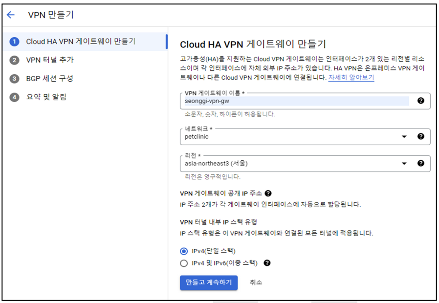 Console : 네트워크 연결 -> VPN -> 고가용성(HA) VPN 선택