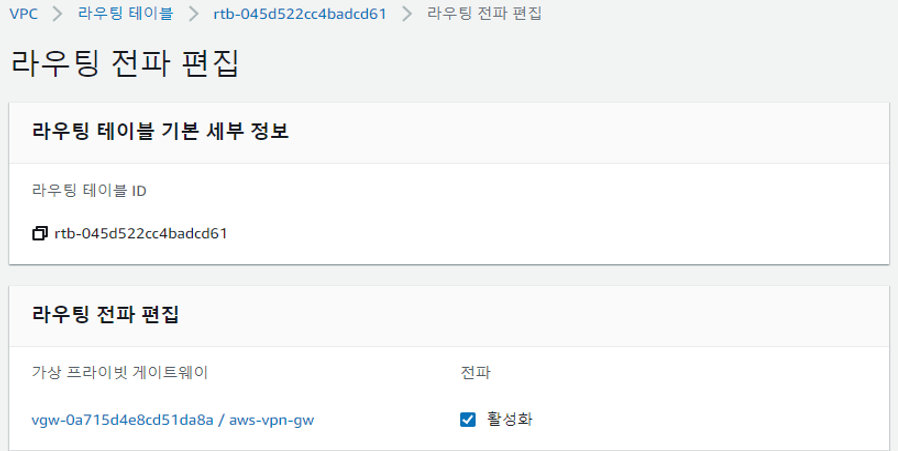 VGW (가상 프라이빗 게이트웨이)가 존재하며, 활성화를 체크하고 저장
