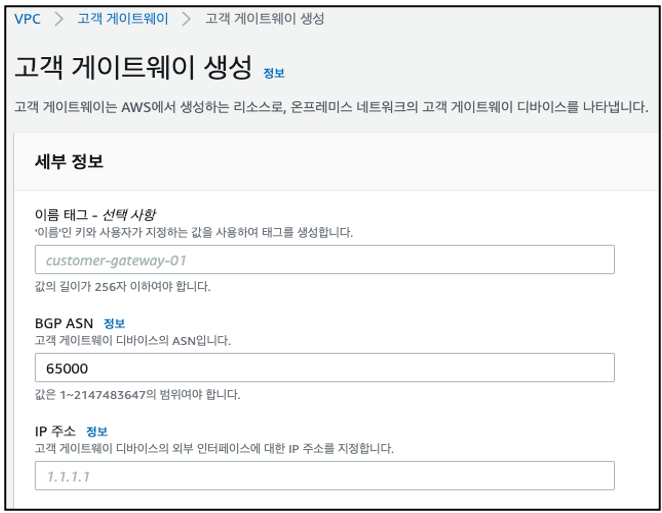 Console : VPC -> 고객 게이트웨이 -> 고객 게이트웨이 생성