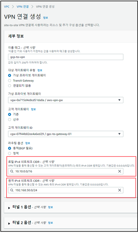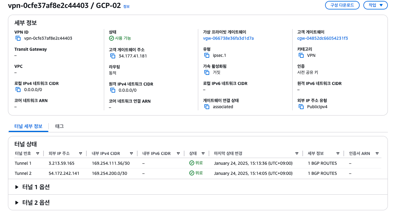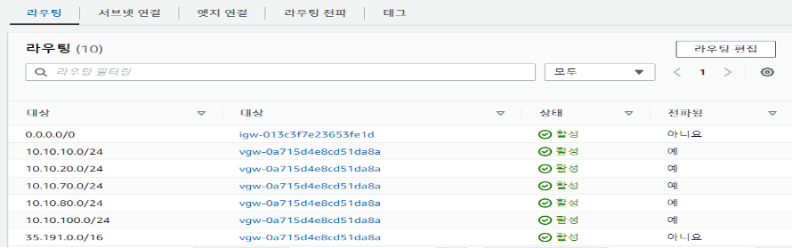 AWS VPC → 라우팅 테이블 → 해당 VPC선택 → 라우팅 편집 GCP대역을 가상 프라이빗 게이트웨이로 선택