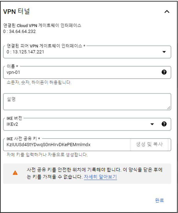 이후 피어 VPN 게이트웨이 AWS측의 Tunnel IP (public)을 받아 입력