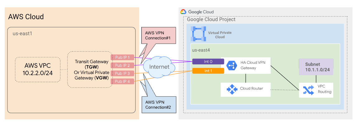 GCP에서 HA VPN은 NIC Interface 2개를 사용하여 터널을 맺습니다. AWS에서는 자기의 IP들은 2개지만, 상대편(Peer IP)는 한개만 지정할 수 있습니다.