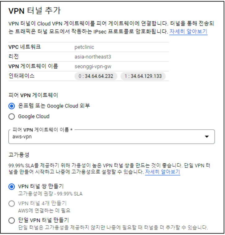 단 이때에 사전에 피어 VPN게이트웨이가 4개로 되어있어야 합니다.