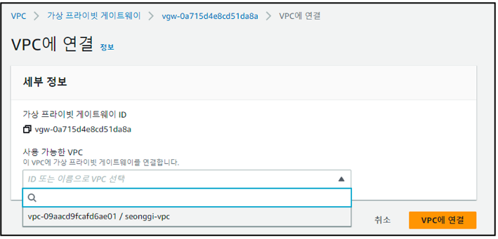 가상 프라이빗 게이트웨이와 VPC 연동 생성된 후 -> VPC에 연결선택