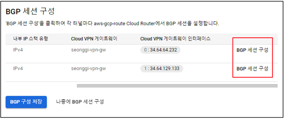 동작 라우팅을 하기 위해 BGP에 대한 세션을 구성합니다.