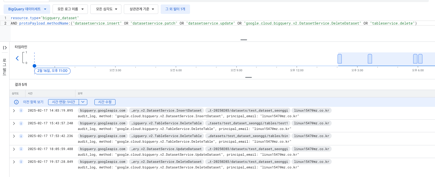 - Dataset 삭제resource.type="bigquery_dataset" protoPayload.methodName="google.cloud.bigquery.v2.DatasetService.DeleteDataset"