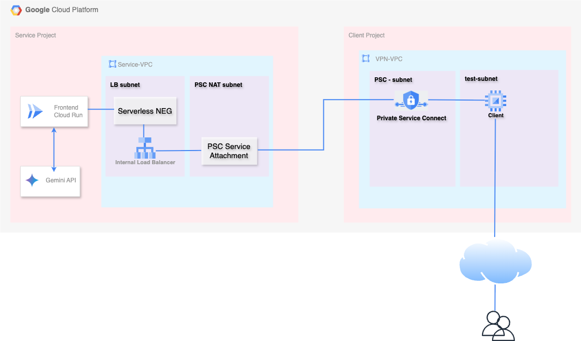 - Service Project: 실제 Cloud Run 서비스와 Gemini API 연동 로직이 존재합니다. 내부 ALB와 PSC 서비스 게시