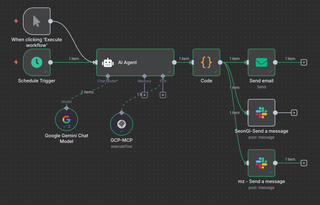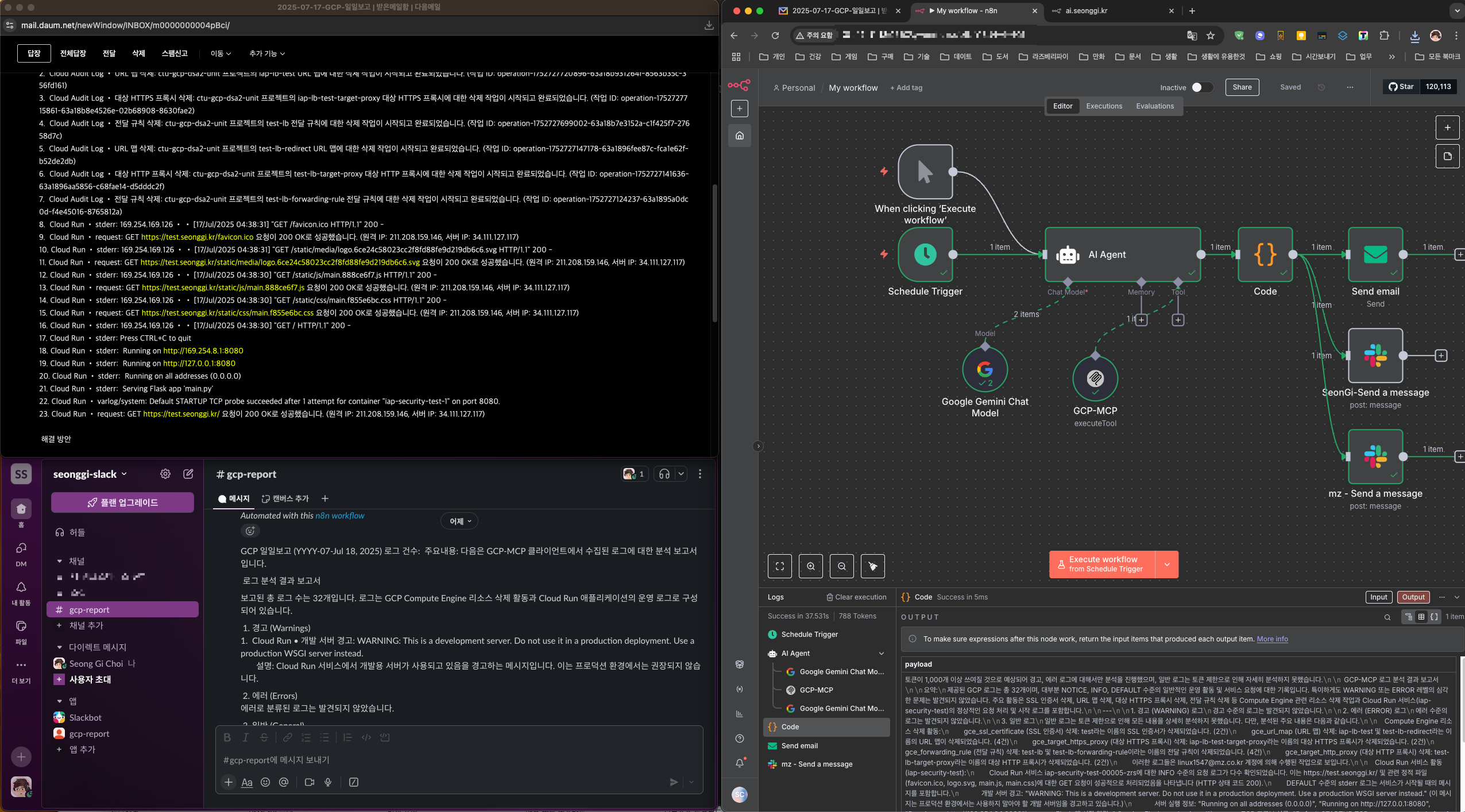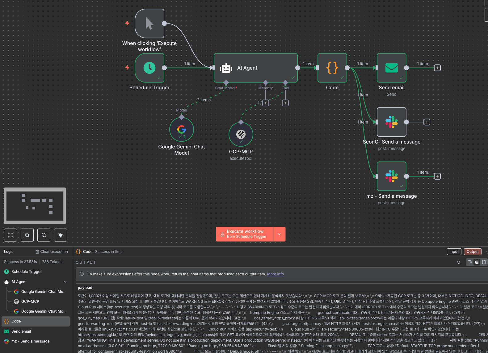그래도 결국 캡쳐 화면에 보이듯 n8n의 AI Agent와 챗모델로는 Gemini 그리고 MCP 서버를 이용하여 매일 GCP의 프로젝트에서 에러, 경고 메시지와 일반로그(중복되는건 제거) 를 받아 메일과 슬랙으로 보고해주는 템플릿을 작성했습니다.