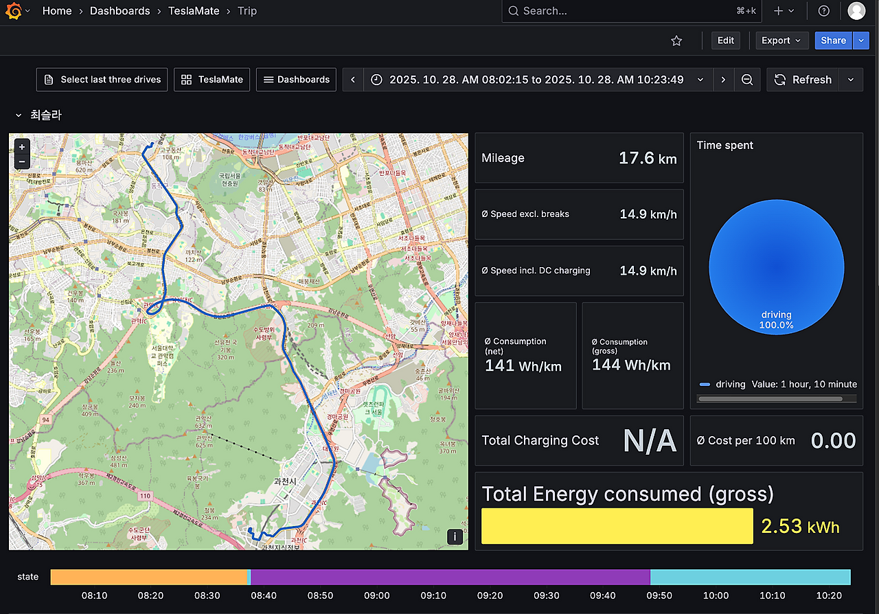 테슬라메이트는 아래와 같이 테슬라의 많은 정보를 받아 저장하고, 시각화 하여 보여주는 오픈소스툴입니다.