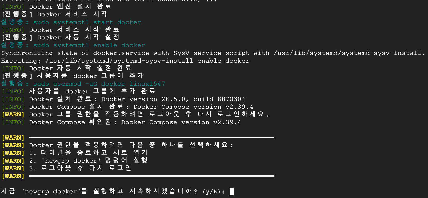 Docker 설치가 끝나면, 권한 부여를 위해 사용자에 대한 그룹 추가가 필요합니다.