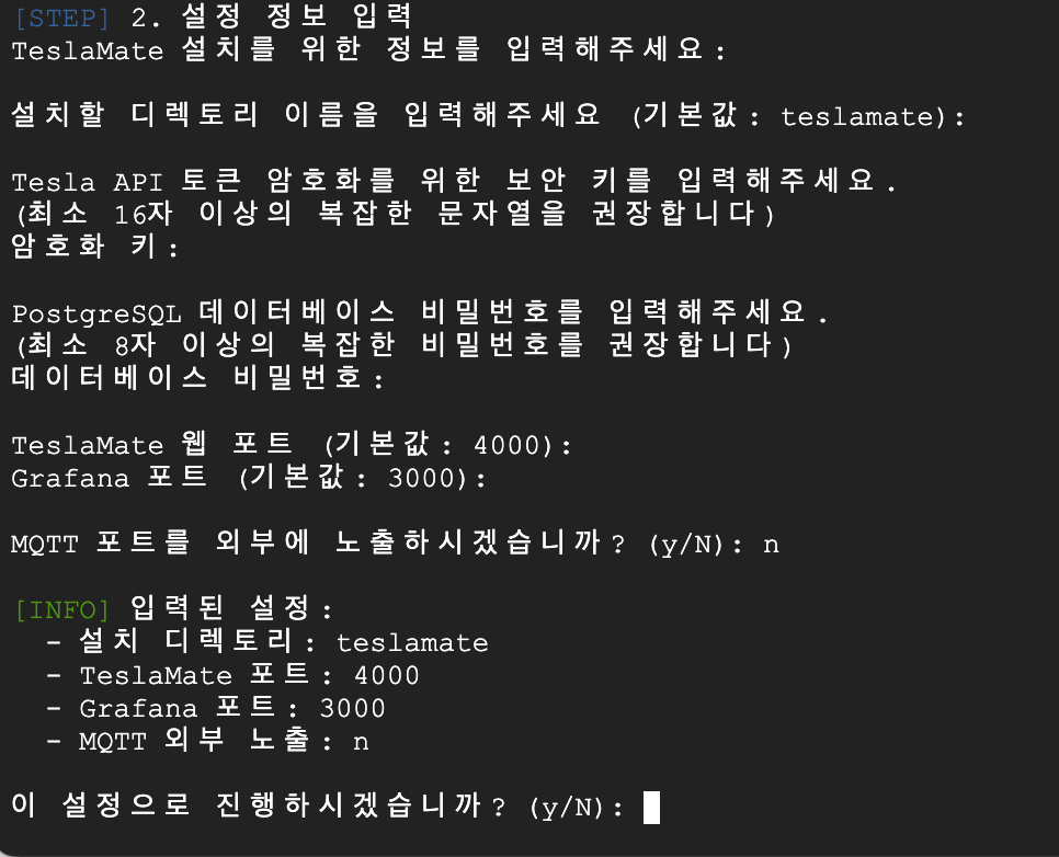 이후 teslamate를 설치할 디렉토리를 묻습니다.
